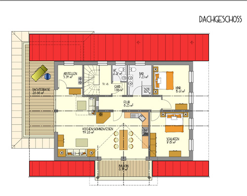 verfügt über zwei Schlafräume ,ein großer Wohnraum mit Essecke und Ausziehcouch sowie Kaminofen und Einbauküche , DU und 2 WC's, Abstellraum, ein Balkon sowie eine 26 m² Dachterrasse mit Panoramablick über die Alpen.