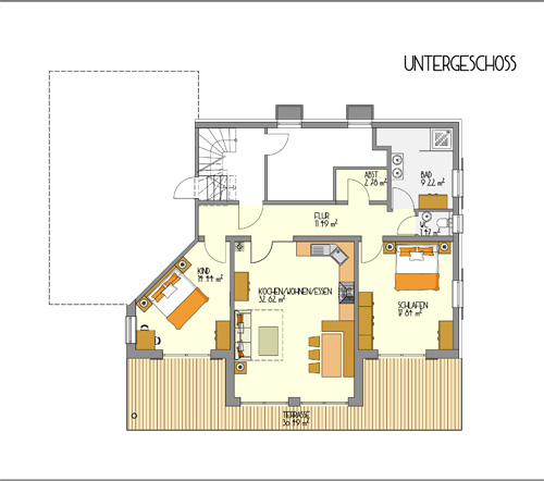 besteht aus zwei Schlafzimmern , ein großzügiger Wohnraum mit Essecke und Ausziehcouch sowie Schwedenofen und Einbauküche, Flur, Abstellraum, begehbare DU, 1 WC und Terrasse.